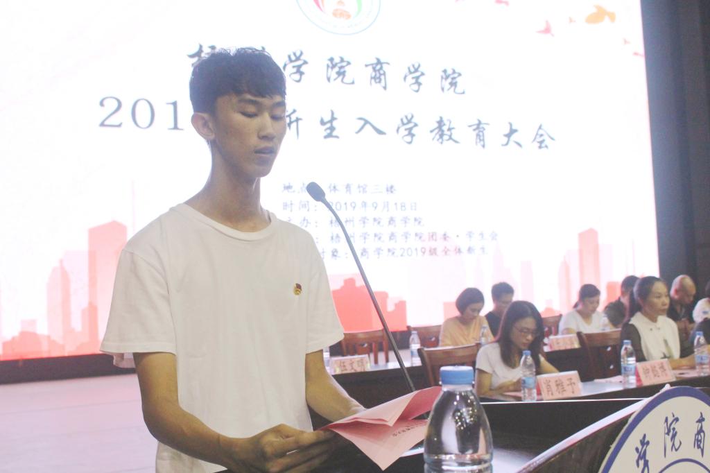 教师代表国际经济与贸易专业教研室主任刘磊老师、在校生代表2017级会计专业班杨思月同学、新生代表2019级金融工程2班秦达谦同学分别在会上作了发言,他们分别从各自角度对2019新生提出了转变角色,尽快适应大学生活,在大学期间不断进取,刻苦钻研,努力实现自己的人生价值,做一个优秀的梧院学子。