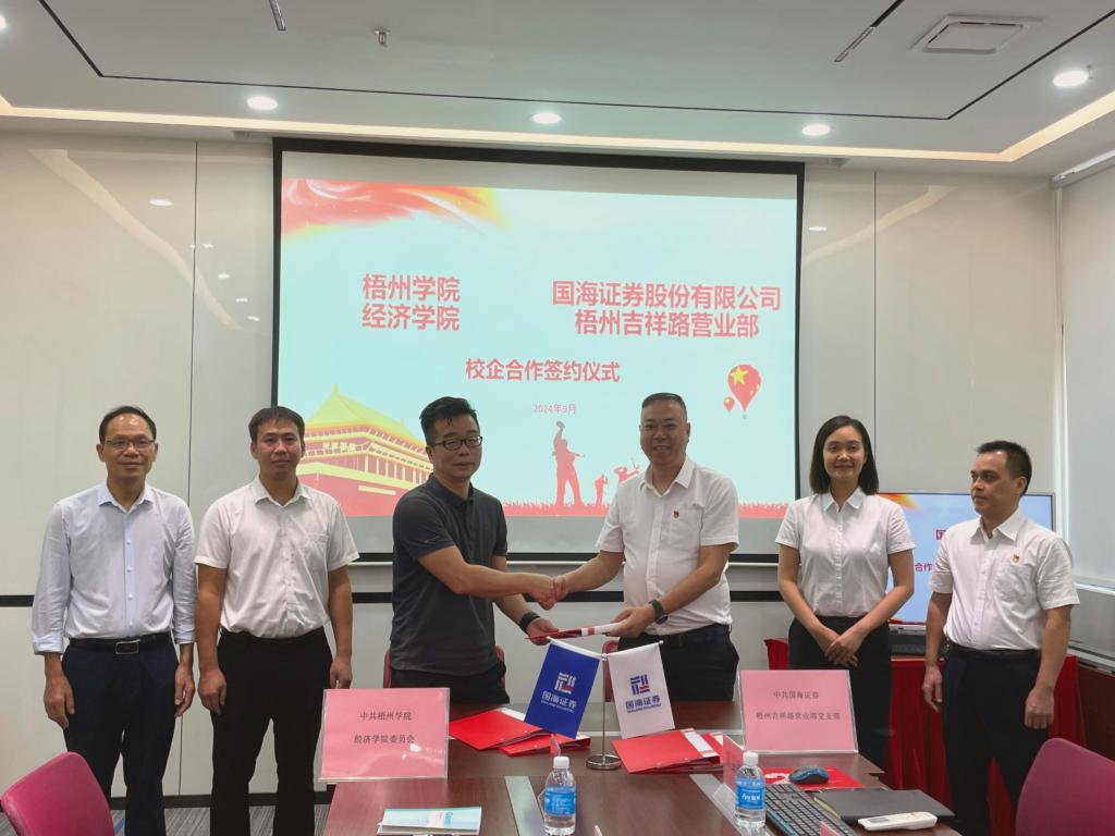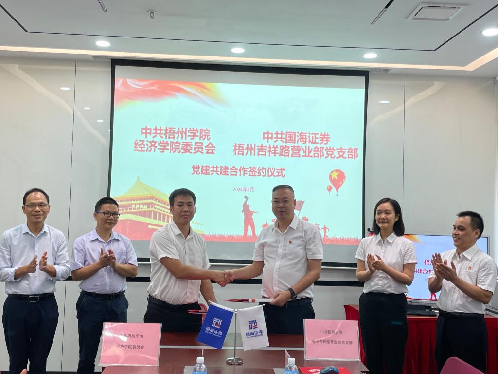 9月26日下午,学院与国海证券股份有限公司梧州吉祥路营业部在该营业部签订党建共建合作协议、校企合作协议。营业部支部书记、总经理林潜,支部宣传委员、梧州藤县藤州大道营业部总经理李庆,梧州吉祥路营业部总经理助理欧婷婷,支部组织委员兼纪检委员、合规管理人员黄曼妮,学院班子全体成员、金融工程教研室主任和辅导员代表参加签约仪式。