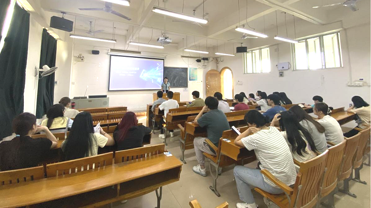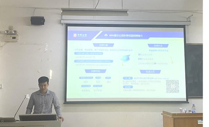11月11日下午,华泰证券股份有限公司梧州西堤三路证券营业部在明理楼中楼504教室开展2025届毕业生就业宣讲会。总经理覃舒闽、综合部主任韦武秋一行、tyc1286太阳成集团毕业班辅导员谢兵、2025届国际经济与贸易、电子商务和金融工程专业毕业生参加就业宣讲会。